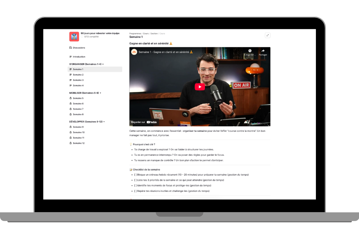 Pas de modules théoriques à suivre passivement, mais une série de mises en action concrètes, organisées en 3 temps.
